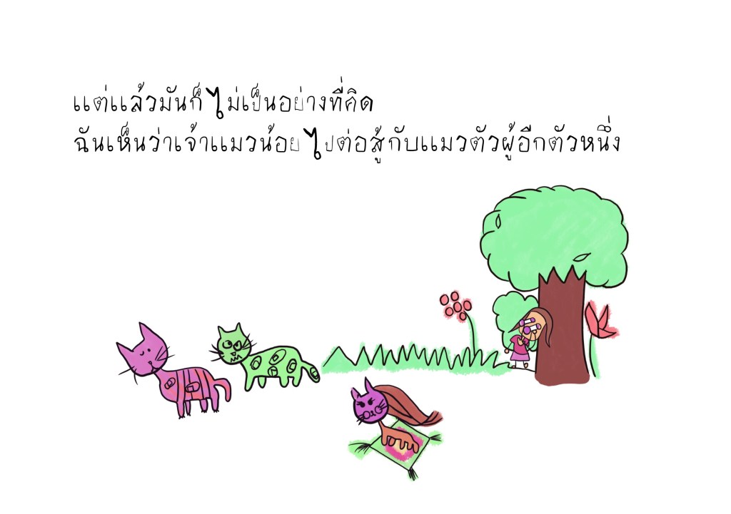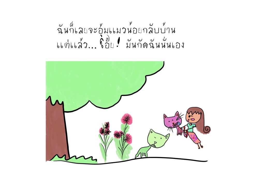 นิทานที่น้องฮานะแต่ง มีเนื้อเรื่องและภาพวาดที่น่ารักมาก ผมชอบมุมมองแบบเด็ก ๆ ที่ “สดใส” และทำให้คาดเดาได้ว่า เหตุการณ์แบบในเรื่องอาจเป็นเหตุการณ์ที่เกิดขึ้นจริง เพราะมันมีชีวิตชีวาจนทำให้ผมอดยิ้มไม่ได้ ที่สำคัญ เมื่อผมดูรายละเอียดเล็ก ๆ น้อย ๆ ที่น้องฮานะแอบใส่ไว้ในภาพวาด (ซึ่งมีคุณแม่ช่วยประกอบภาพให้นิดหน่อย) ผมก็ยิ่งยิ้มกว้างมากขึ้น