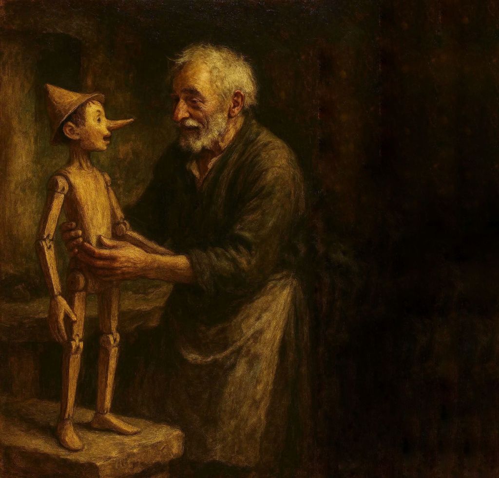 เมื่อเจปเปตโตแกะสลักแขน พิน็อคคิโอก็ยกแขนขึ้นมาเอง และตบหน้าเจปเปตโตเบา ๆ ด้วยท่าทางซุกซน เจปเปตโตหัวเราะพลางพูดว่า “เจ้าหุ่นนี่ซนแต่เกิดเลยนะ” เขารู้สึกเหมือนกำลังพูดกับลูกชายจริง ๆ ความเหงาในใจที่เคยเงียบงันเริ่มถูกเติมเต็มด้วยเสียงหัวเราะและความเคลื่อนไหวของพิน็อคคิโอ
