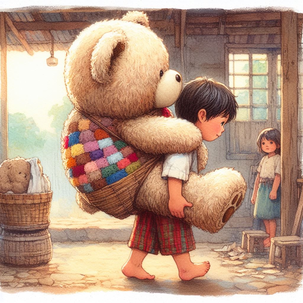 จริง ๆ แล้ว ในตอนแรก…ฮัคตั้งใจที่จะซื้อตุ๊กตาจากโรงงานมาให้ยู แต่เนื่องจากตุ๊กตาในโรงงานมีราคาแพงและเขาก็ทำงานได้เงินไม่มากนัก ดังนั้น ช่วงสัปดาห์ที่ผ่านมา ฮัคจึงเที่ยวเก็บเศษผ้าขนปุย ๆ ที่เหลือจากการทำตุ๊กตาในโรงงาน แล้วใช้เวลาว่าง (ที่เขายอมตื่นเช้าขึ้นและกลับบ้านดึกขึ้น) เพื่อเย็บเศษผ้าเหล่านั้นให้กลายเป็นตุ๊กตาสำหรับน้องสาวที่เขารัก